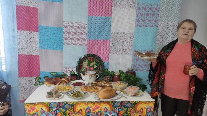 Просторный зал Дома культуры превратился в уютную русскую горницу, где воздух был наполнен ароматами свежей выпечки и душистых трав. Центральным событием стала большая экспозиция блюд, которые участники фестиваля выставили на дегустацию. Борщ, холодец, блины, каша, хлеб домашней выпечки, различные пироги и пирожки, клюквенный соус. Хрустящая квашеная капуста, приготовленная по старинным рецептам, и простая, но такая любимая всеми отварная картошка с солёными огурчиками стали настоящим воплощением народного вкуса. Компоты из садовых и лесных ягод. Были заварены чаи из трав произрастающих на данной территории. Каждое блюдо было приготовлено по русскому рецепту. Для русского человека, еда – это не просто еда, но и душа, вложенная в это блюдо.
