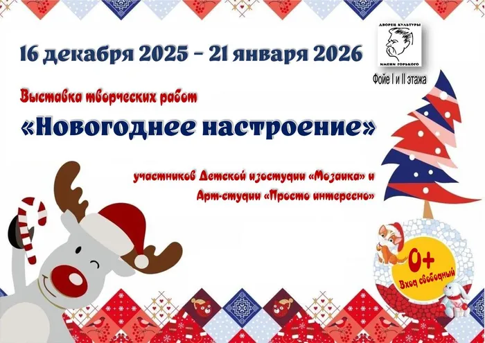 Дворец культуры имени Горького в преддверии Новогодних и Рождественских праздников украсит выставка «Новогоднее настроение», где будут представлены яркие и неповторимые творческие работы участников Детской изостудии «Мозаика» и Арт‑студии «Просто интересно».