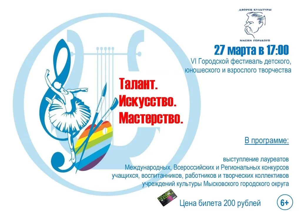 Друзья! 27 марта, в преддверии профессионального праздника всех деятелей культуры и искусства, во Дворце культуры имени Горького состоится VI Городской фестиваль детского, юношеского и взрослого творчества «Талант. Искусство. Мастерство». Уже шестой год его организатором выступает МАУ МГО «ДК им. Горького» при поддержке МКУ «Управление культуры, спорта, молодёжной и национальной политики МГО».