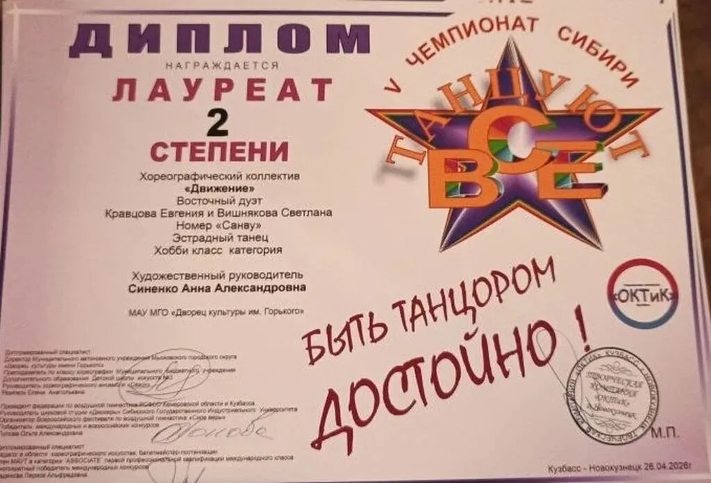 26 апреля в Новокузнецке, в ДК «Алюминщик», Хореографический коллектив «Движение» принял участие в V Чемпионате Сибири «Танцуют все», организованном творческой компанией «ОКТиК». Выступления наших танцоров вновь доказали: мастерство, упорство и любовь к искусству не остаются незамеченными!